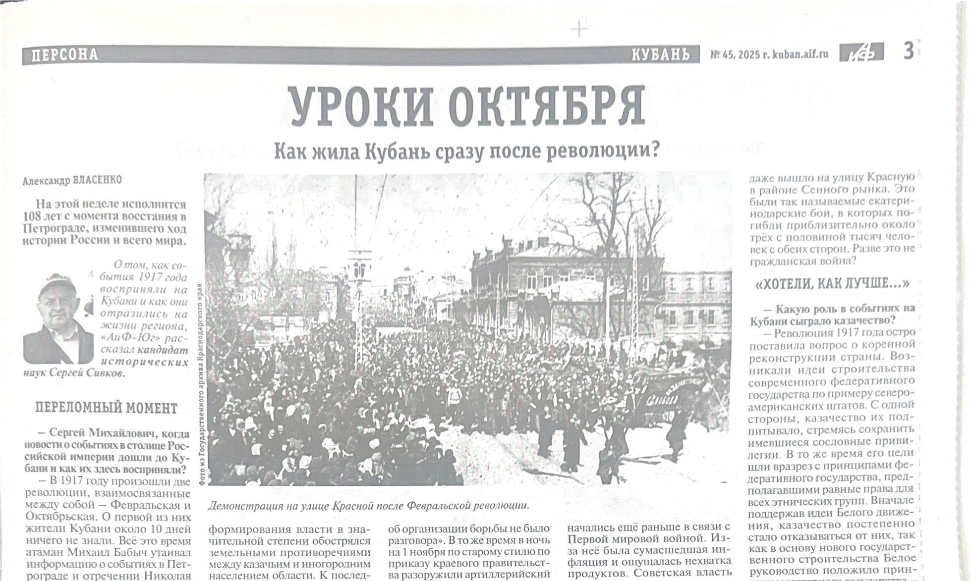 К 108-й годовщине Октябрьской Революции в газете «Аргументы и факты - Кубань» опубликовано интервью доцента кафедры гуманитарных дисциплин, …