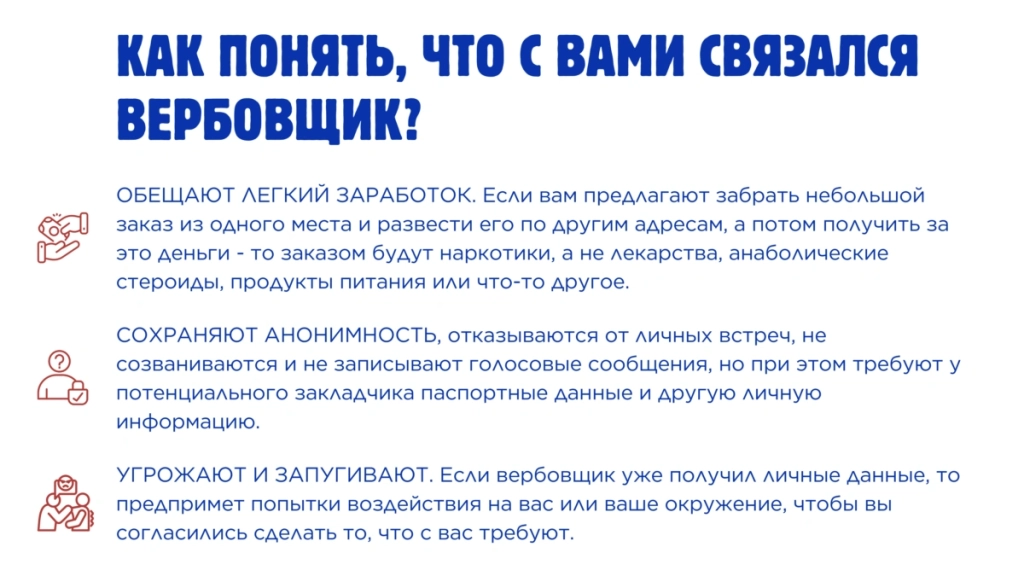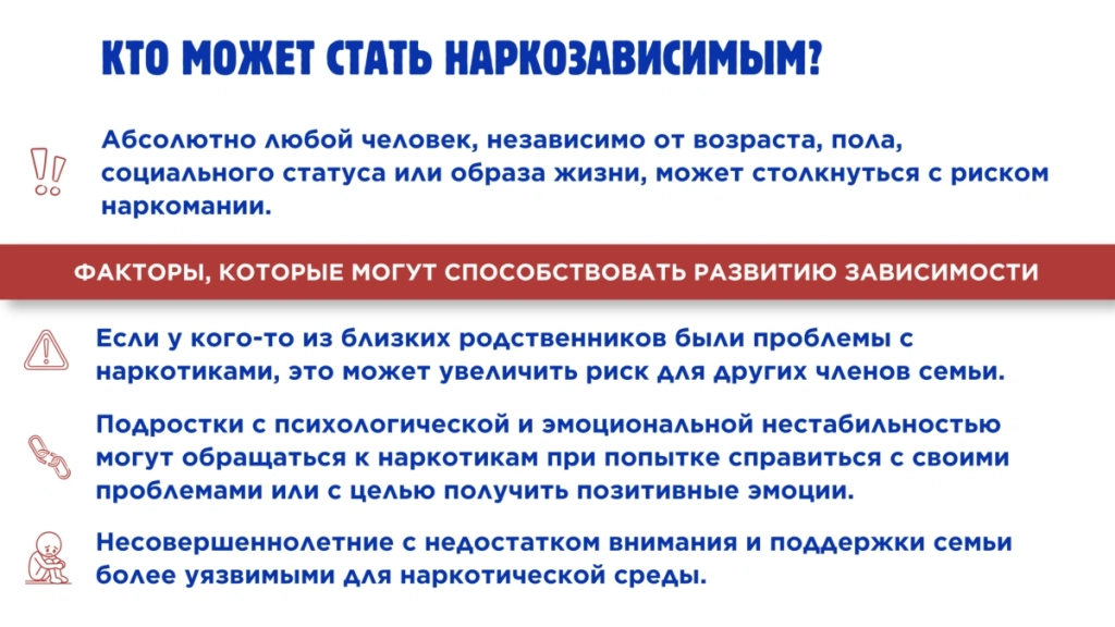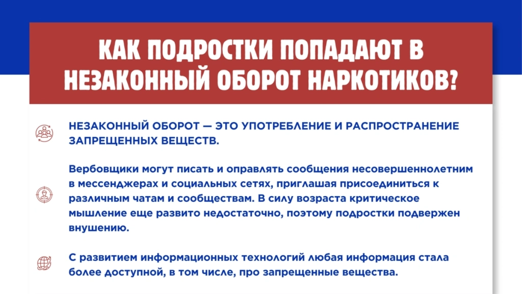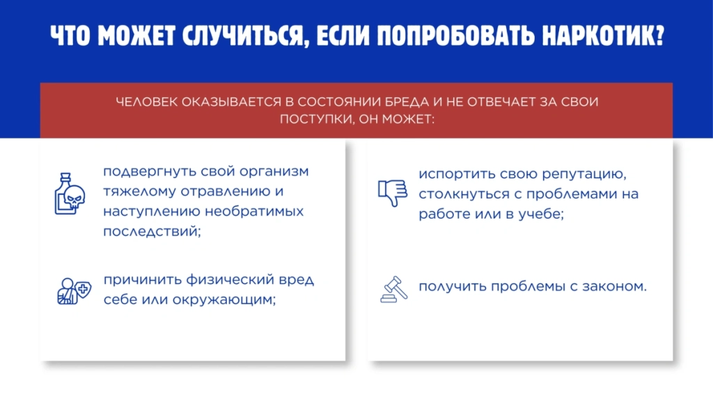 - Информирование о рисках наркотического воздействия и уголовной ответственности за распространение психоактивных веществ.